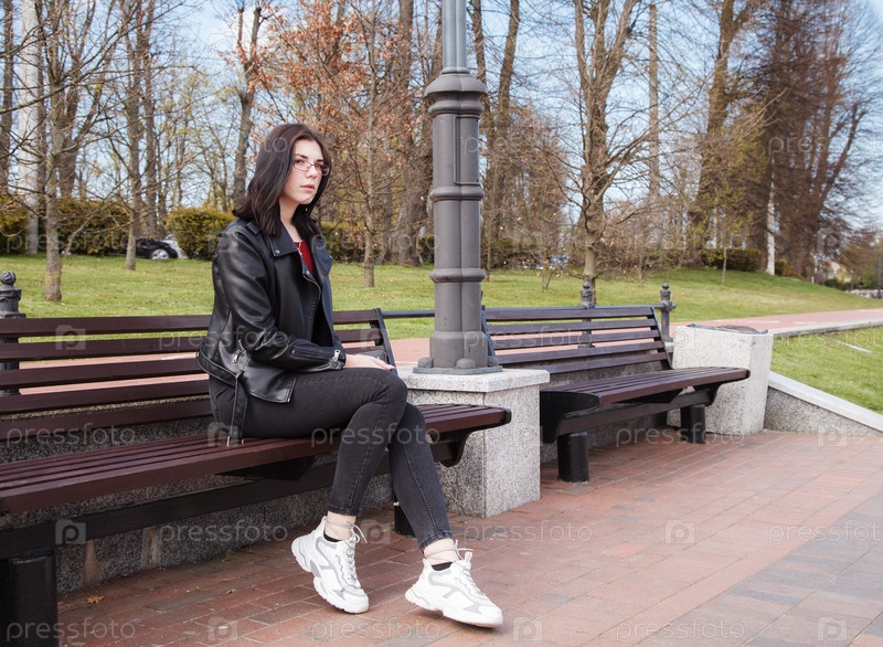 Молодая девушка в черной куртке и джинсах сидит на скамейке в городском парке в солнечный весенний день