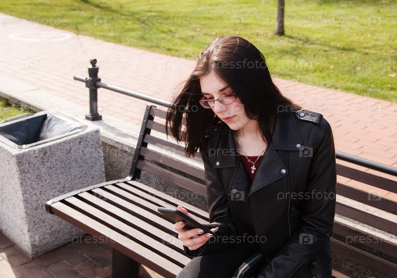 Молодая девушка в черной куртке и джинсах смотрит на дисплей смартфона, сидя на скамейке в городском парке в солнечный весенний день. Открытый крупным планом