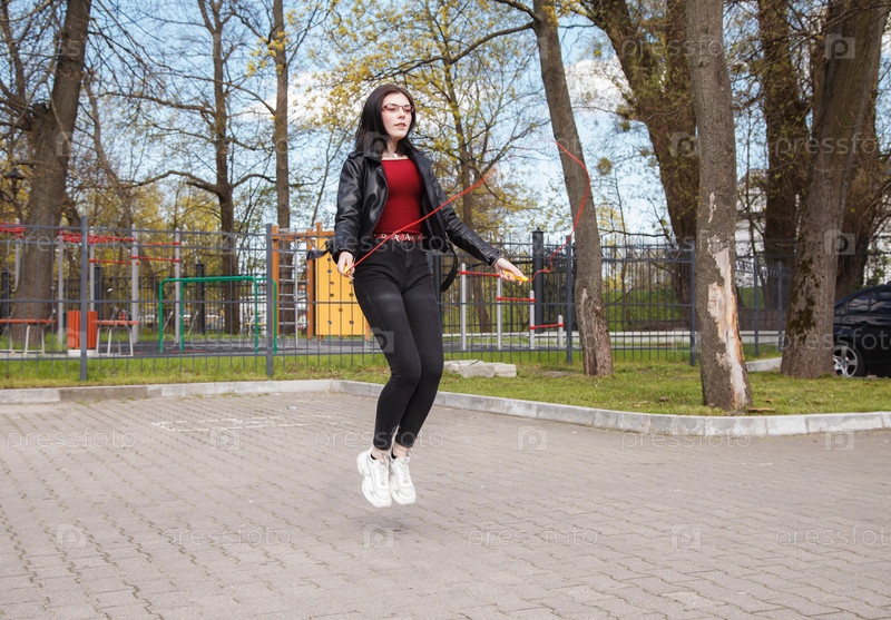 Молодая брюнетка в черной куртке и джинсах прыгает со скакалкой на открытом воздухе в солнечный весенний день