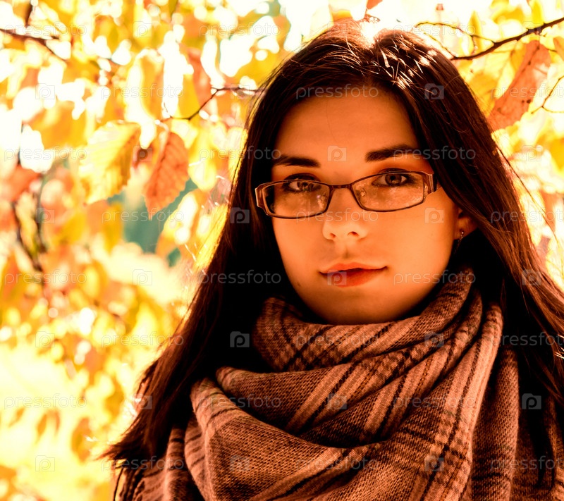 Портрет молодой красивой девушки в коричневой куртке в городском парке в солнечный осенний день