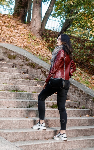 Молодая девушка в коричневой куртке и черных джинсах стоит на лестнице в городском парке в солнечный осенний день