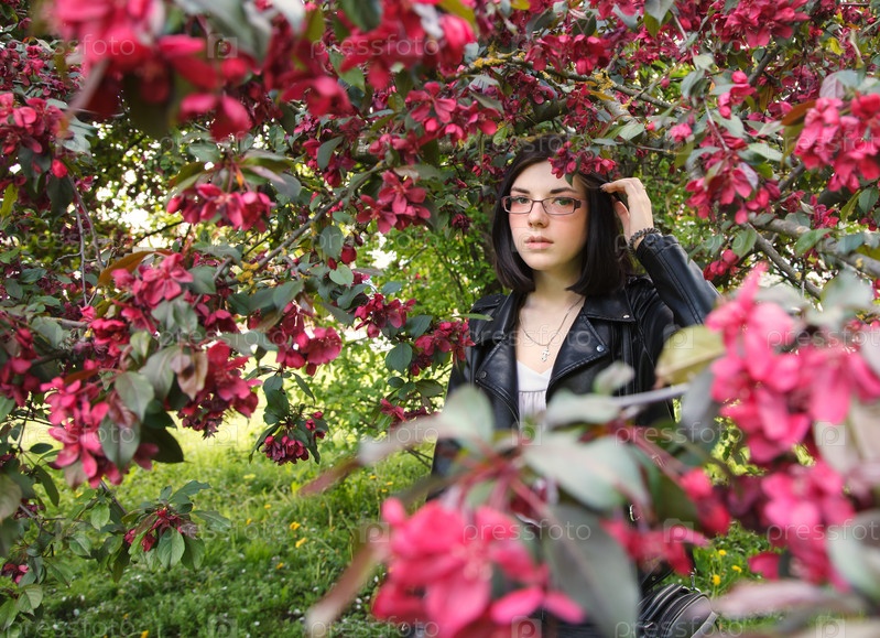 Портрет молодой красивой брюнетки в черной куртке, стоящей возле цветущей вишни в солнечный весенний день. Открытый крупным планом
