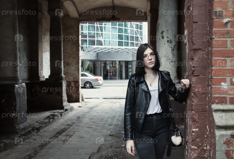 Грустная молодая девушка в черной куртке и джинсах стоит в старой арке на городской улице в летний день. крупным планом на открытом воздухе