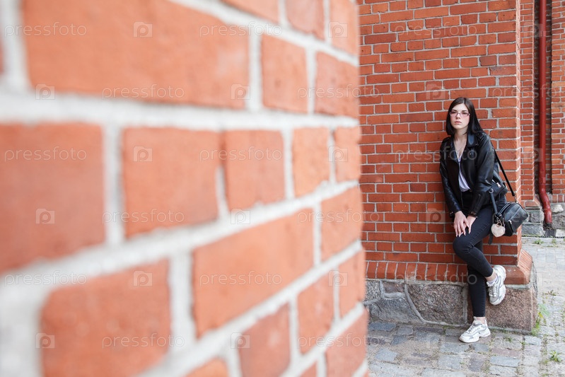 Молодая красивая брюнетка в черной куртке и джинсах стоит возле стены готической церкви в летний день