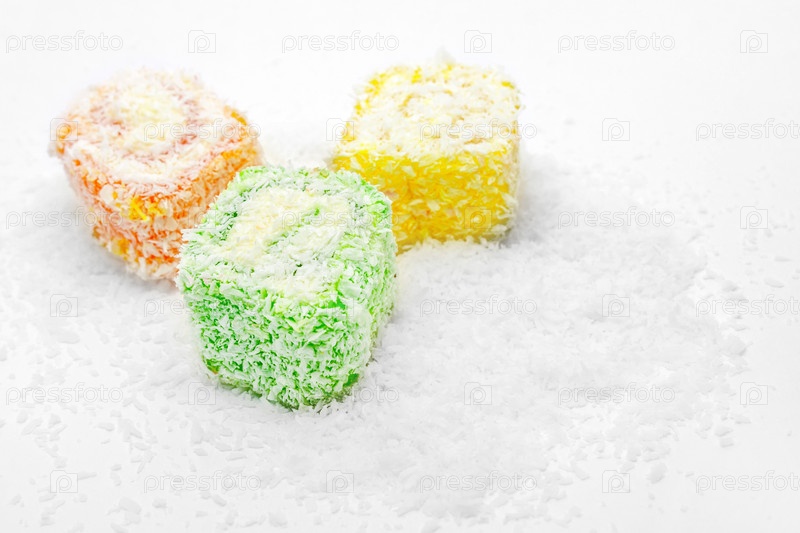 Разноцветный рахат-лукум на кокосовой стружке крупным планом
