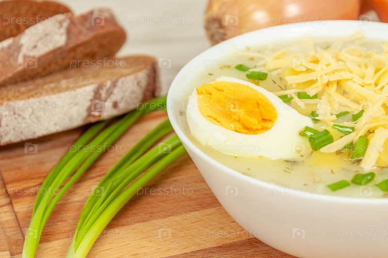 Сырный суп в белой тарелке на фоне хлеба и лука