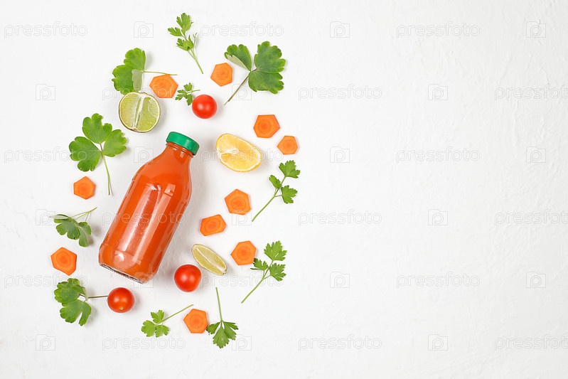 Детокс-напиток в стеклянном кубке, кусочки моркови и петрушки на светлом фоне. Свежий натуральный морковный коктейль или сок, концепция похудания, свежие фрукты и овощи, реклама кафе, избирательный фокус