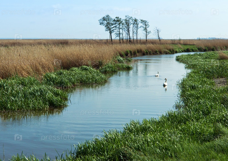 Река впадает в море, небольшая речка с птицами, заросшие берега реки