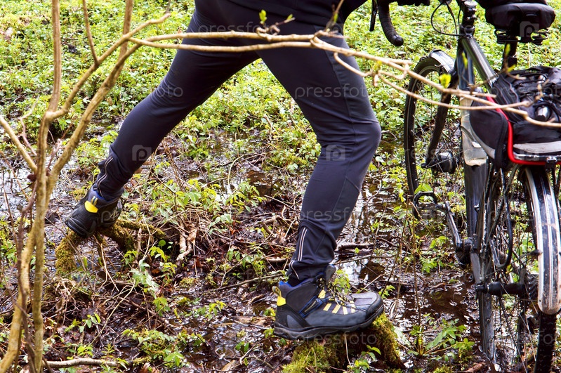 Велосипедист пробирается через непроходимый лес, пересекая ямы и болота в лесу