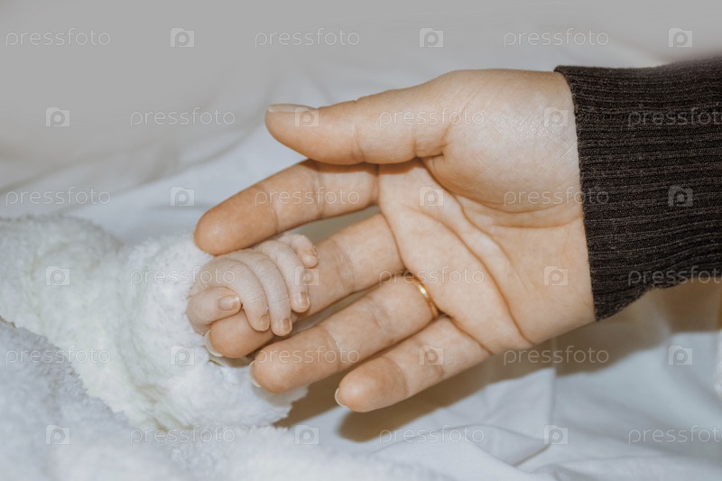 Мать держит за руку новорожденного ребенка крупным планом на белом фоне, концепцию материнства и ухода, воспитания детей, защиты беременности, абортов и послеродовой депрессии, грудного вскармливания