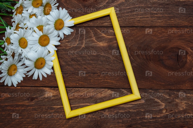 Пустая желтая пластиковая фоторамка с букетом белых ромашек на коричневом деревянном фоне, вид сверху, концепция поздравительной открытки, место для текста, пространство для копирования, плоская планировка