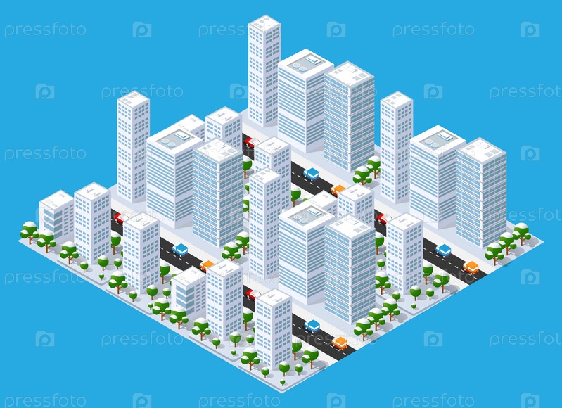 Плоская изометрическая карта, пейзажный город, здание-небоскреб, парки, кафе, достопримечательности