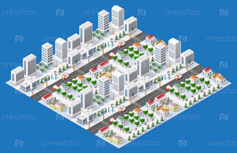 Плоская изометрическая карта, пейзажный город, здание-небоскреб, парки, кафе, достопримечательности