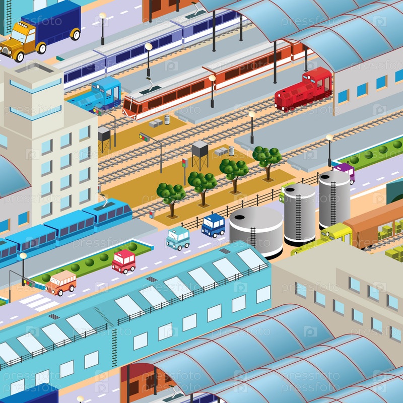 Векторный железнодорожный вокзал изометрический вид на архитектурный блок, здание, бизнес, мультиштажное городское строительство, 3D иллюстрация