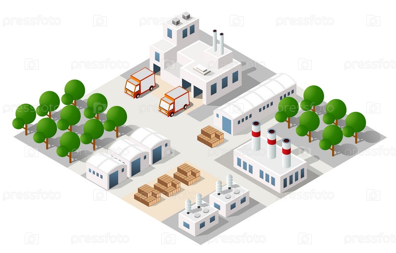 Ландшафт промышленных объектов заводов, фабрик, автостоянок и складов. Изометрический вид сверху на город
