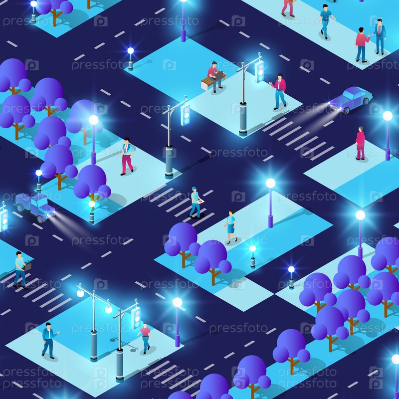 Ночной город с фонарями Изометрические люди, идущие 3D иллюстрация