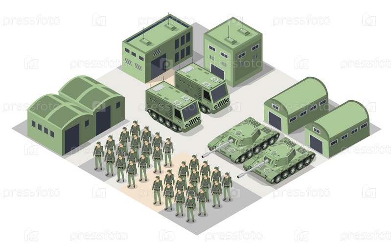 Объект базового лагеря для строительства армии дизайна для строительства вооруженных войск изометрии
