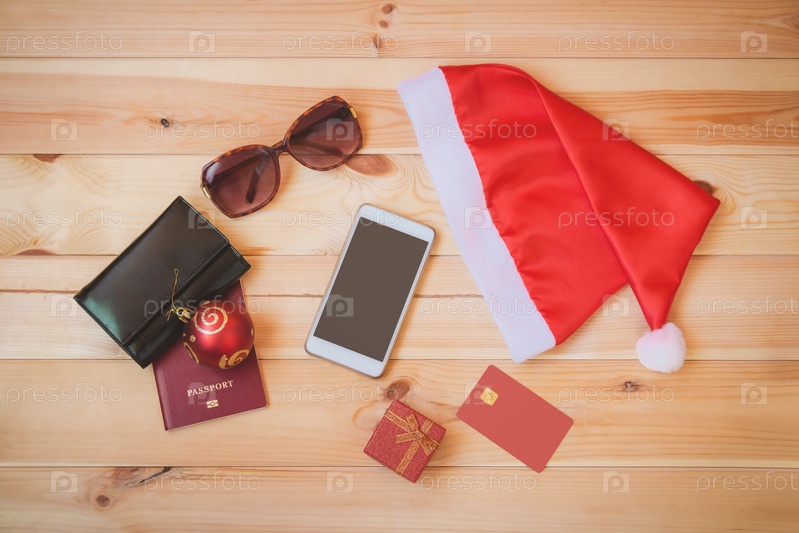 Шапка Санта-Клауса и набор вещей для праздников на деревянном фоне. Концепция рождественского путешествия