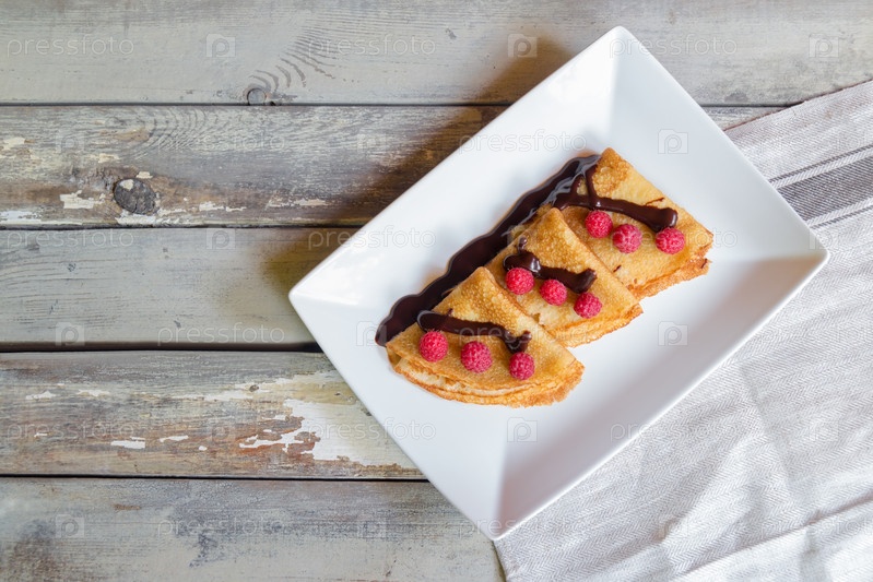 Блинчики со свежей малиной и шоколадным сиропом на старом деревянном фоне. Вид сверху, пространство для копирования