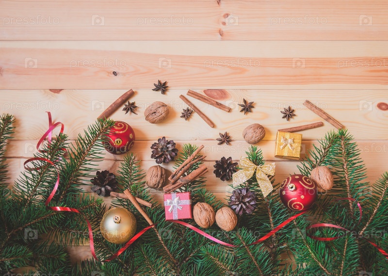 Рождественская граница из еловых веток, рождественских украшений, специй, грецких орехов и подарков. Винтажный стиль. Копирование пространства, вид сверху