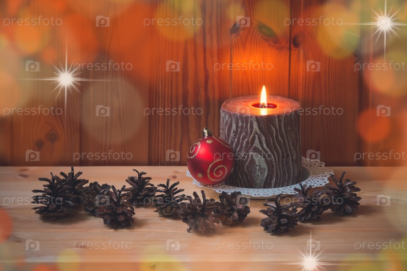 Рождественская свеча, красный шар и сосновые шишки. Посмотреть с копией пространства