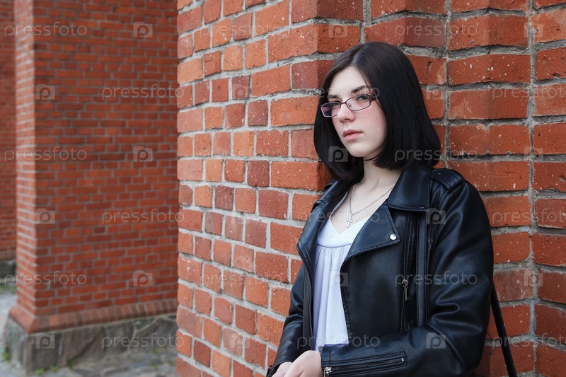 Молодая красивая брюнетка в черной куртке и джинсах стоит возле стены готической церкви в летний день. Открытый крупным планом