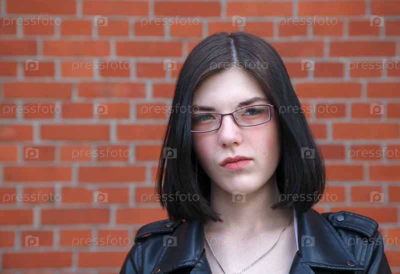 Портрет молодой красивой брюнетки недовольной девушки возле кирпичной стены. крупным планом на открытом воздухе