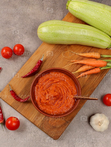 Икра кабачков с ингредиентами для приготовления на бетонном столе, концепция домашнего консервирования и сбора овощей, здоровые органические продукты, помидоры, кабачки, морковь и перец на кухонном столе,