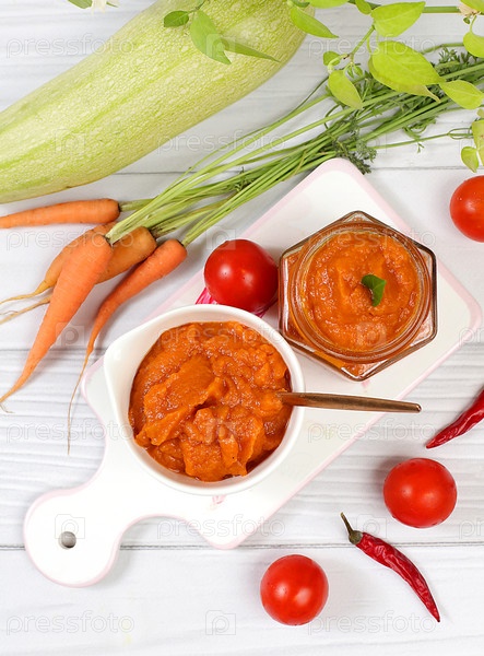 Икра кабачков с ингредиентами для приготовления на бетонном столе, концепция домашнего консервирования и сбора овощей, здоровые органические продукты, помидоры, кабачки, морковь и перец на кухонном столе,