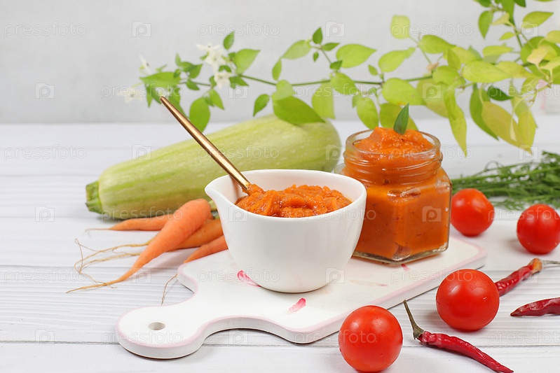 Икра кабачков с ингредиентами для приготовления на бетонном столе, концепция домашнего консервирования и сбора овощей, здоровые органические продукты, помидоры, кабачки, морковь и перец на кухонном столе,