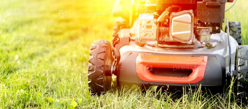 Газонокосилка на скошенной зеленой лужайке