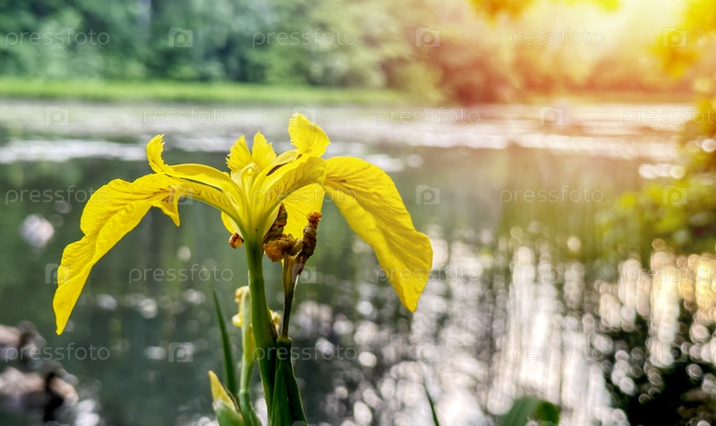 Красивый ирис на пруду в солнечном свете