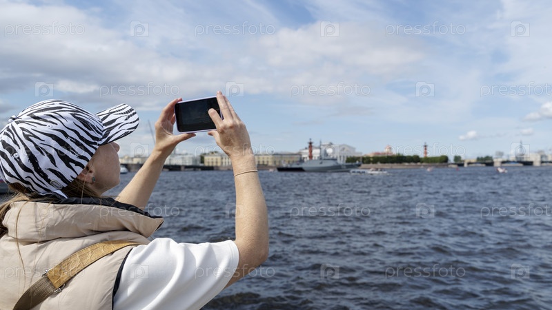 Санкт-Петербург, Россия, 22 июля 2023 года: девушка фотографирует достопримечательности Санкт-Петербурга на смартфон