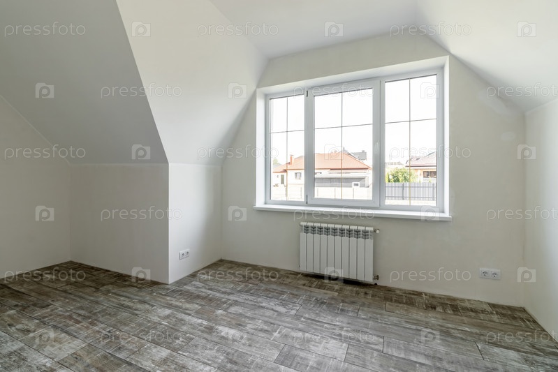 Комната в частном доме сразу после укладки пола, белые неотделанные стены и потолок