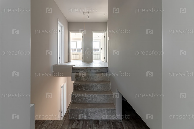 Комната в частном доме сразу после укладки пола, белые неотделанные стены и потолок
