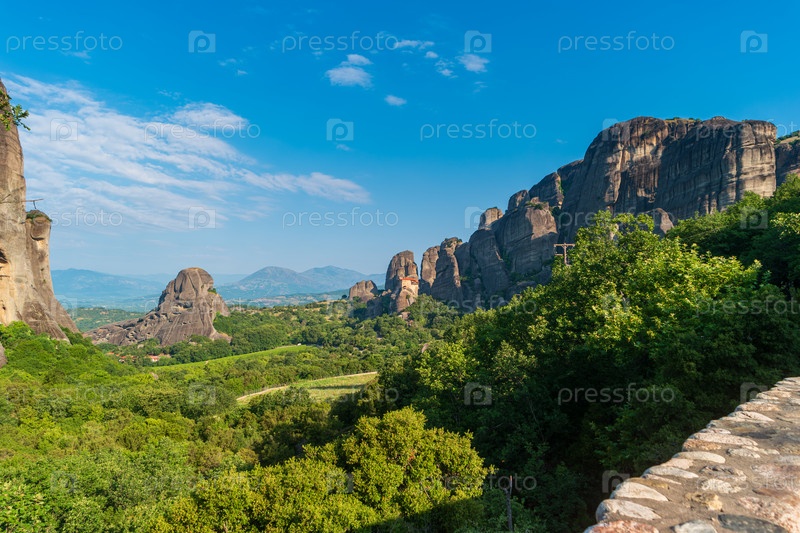 Вид на природную достопримечательность Скалы горы Метеоры с монастырем на вершине. Пейзаж Фессалийской равнины, Греция