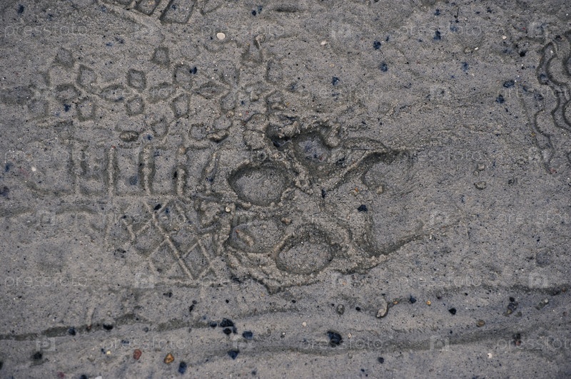 Следы на песке - след собаки и след ботинка