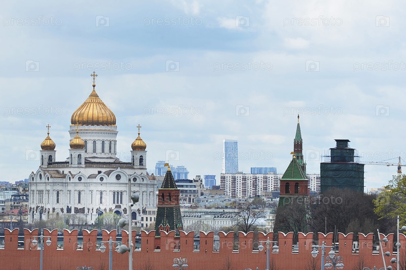 Вид на Храм Христа Спасителя и Кремлевскую стену в Москве