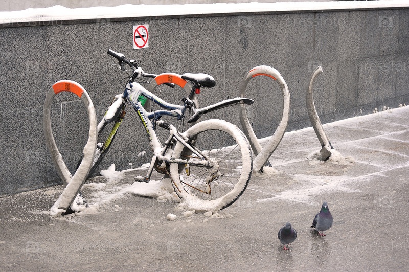 Припаркованный велосипед на велостоянке в Москве