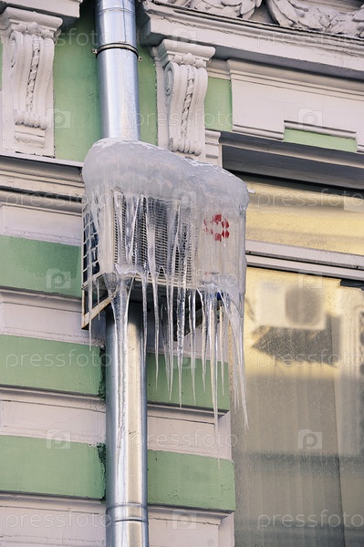 Сосульки опасно свисают с блока кондиционера на стене дома