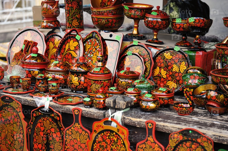 Продажа русских расписных сувениров на барахолке в Измайлово в Москве