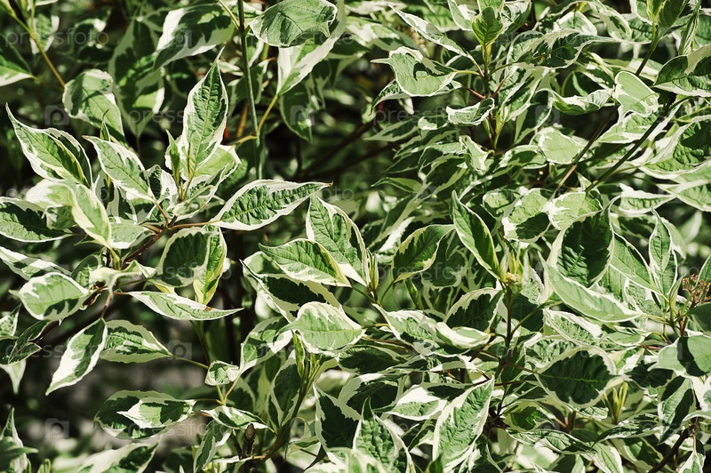 Кустарник с зелеными листьями с белой окантовкой. Дерен