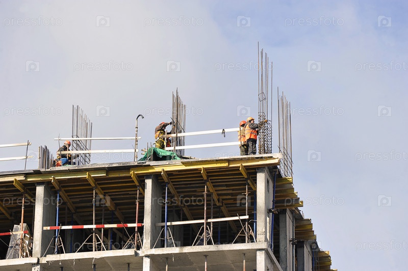 Рабочие делают железную обвязку при строительстве железобетонного дома