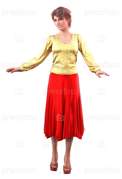 3D Девушка в золотой рубашке и красной юбке