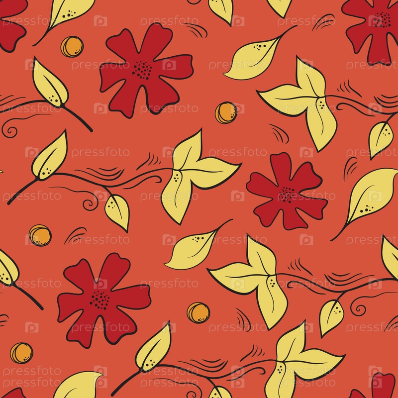 Бесшовный ботанический узор с цветами, ягодами и листьями на красном фоне