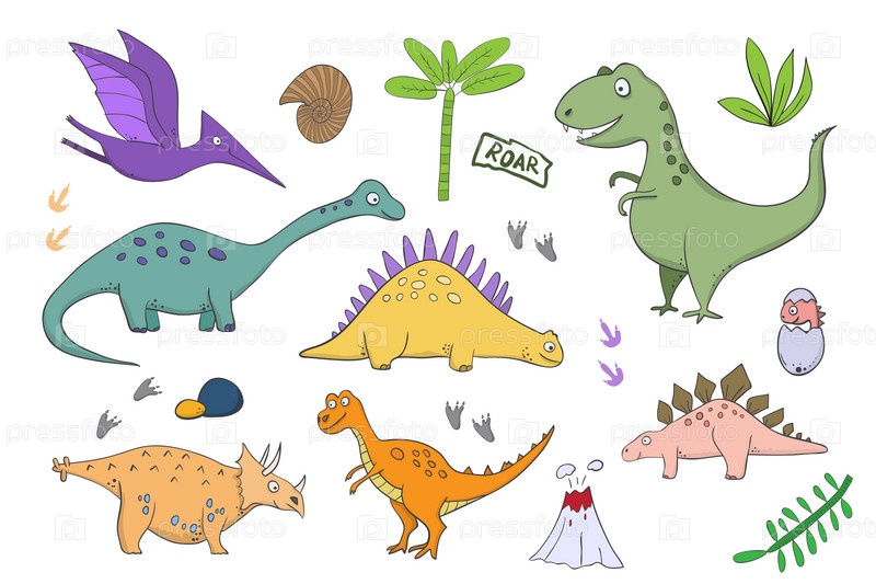 Большой Набор с динозаврами - иллюстрации динозавров в мультяшном стиле