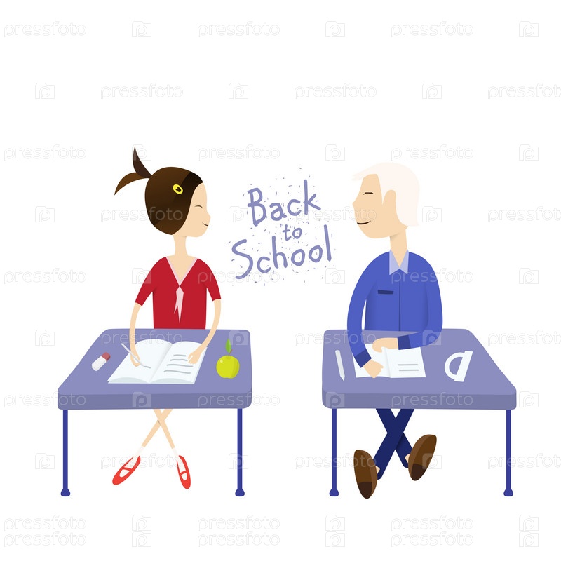 Школьник и школьница сидят за партами, смотрят и улыбаются друг другу - снова в школу