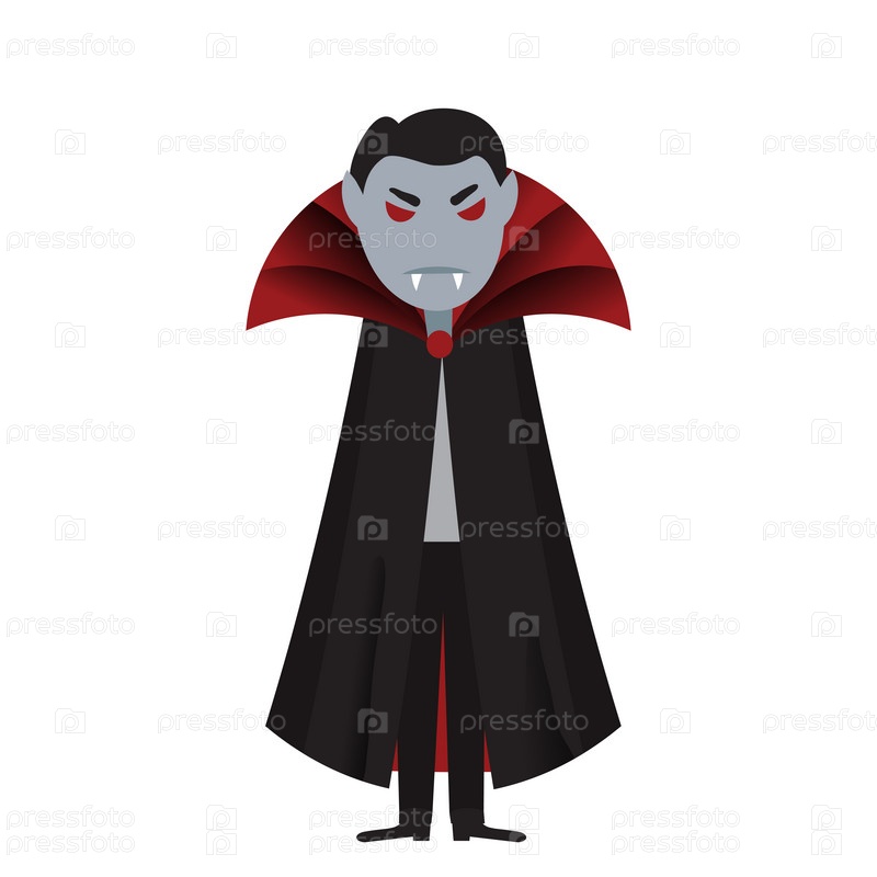 Страшный вампир Дракула в черном плаще с красными глазами, иллюстрация шаржа