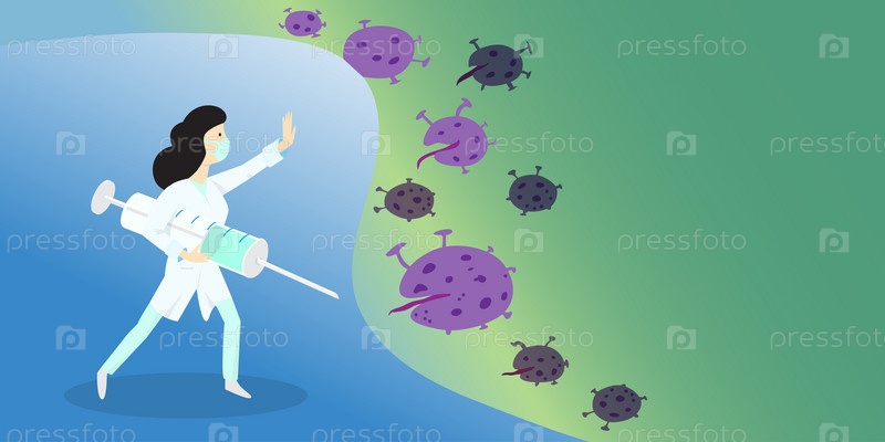 Храбрый медик, врач борется с надвигающейся болезнью в виде вирусов