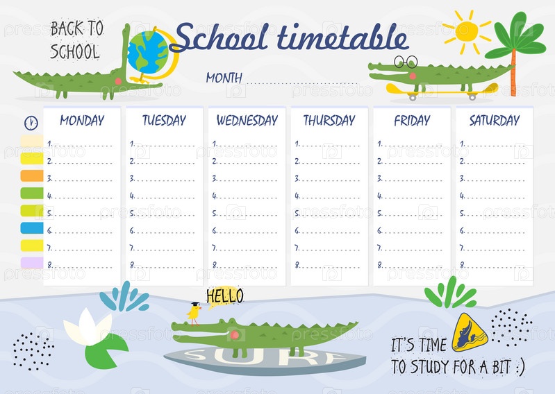 Школьное расписание с забавными крокодилами, расписание еженедельных занятий на доске в мультяшном стиле